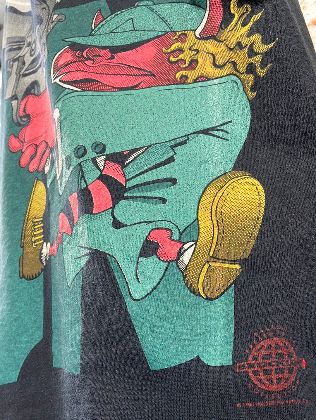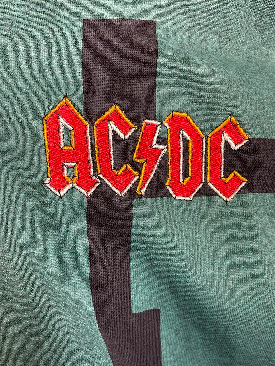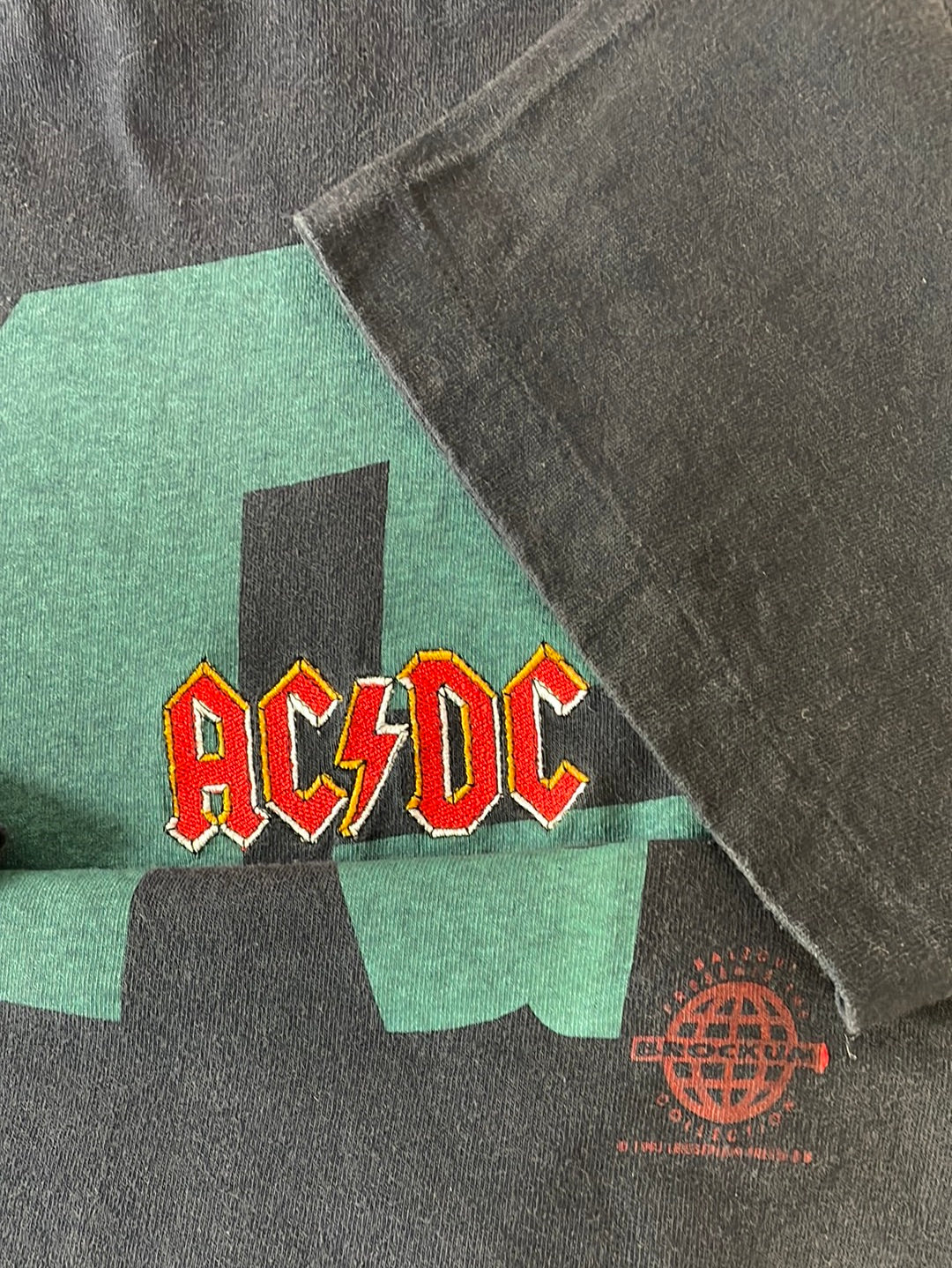 This 1993 AC/DC tee will blow you away with it's jumbo print and embroidered pocket logo. Condition is great with rich color and solid graphics. Single-stitch on bottom hem and sleeves.