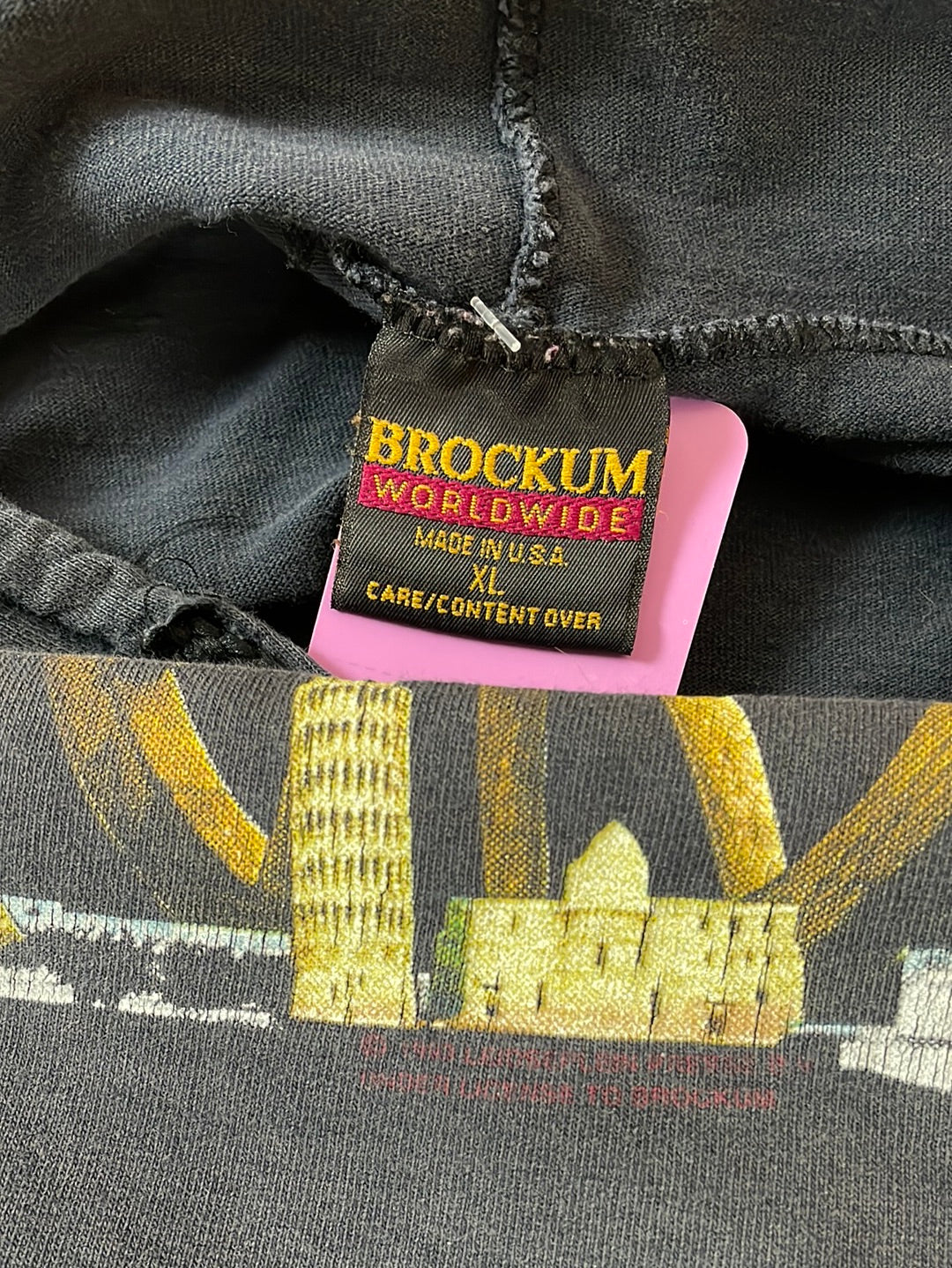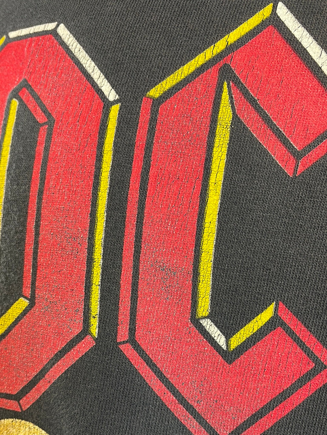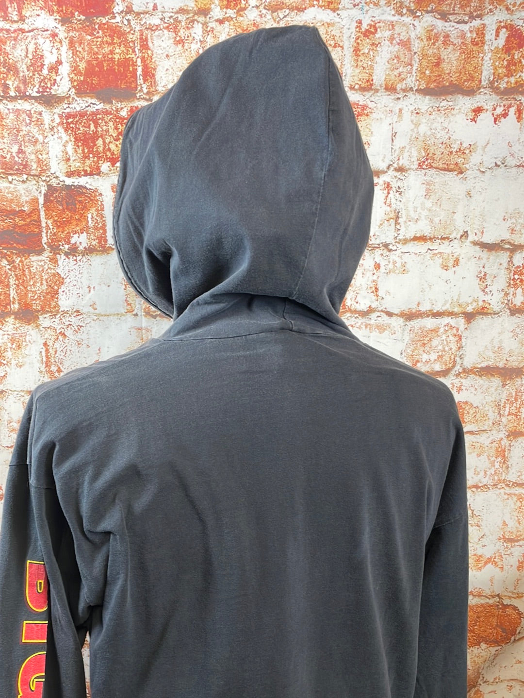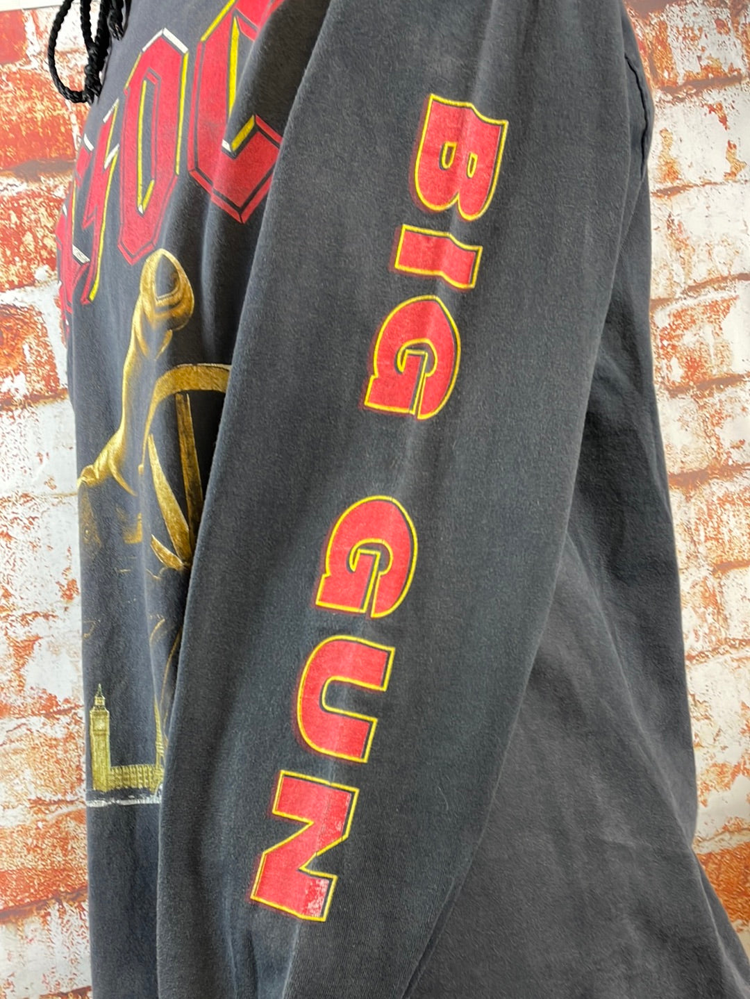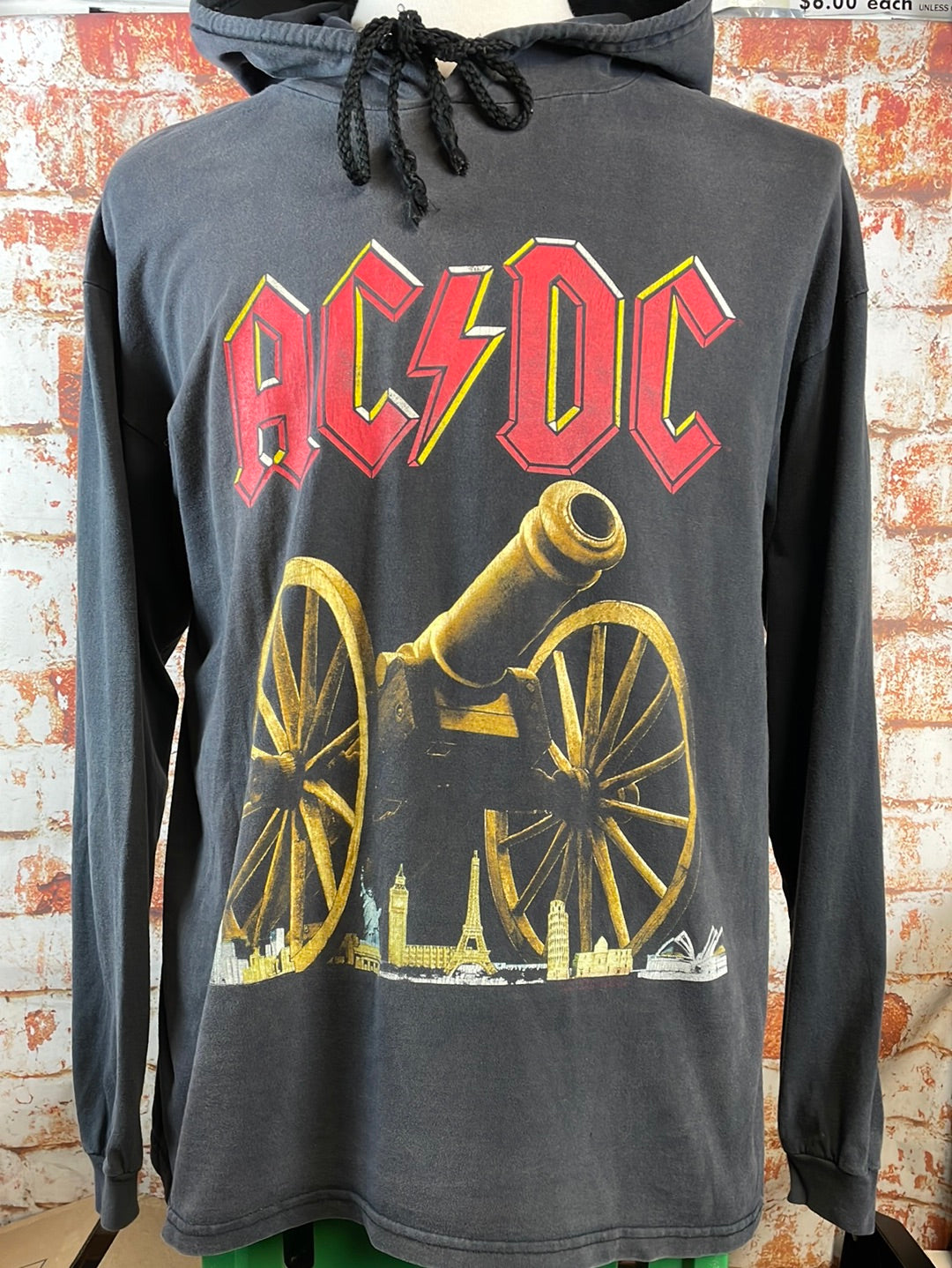 1993 AC/DC hooded long sleeve tee with sleeve print. Fabric is faded from wash and wear with a few spots of discoloration under the right sleeve. The graphic is cracked but no fall-out and the image is still very clear. Lightweight cotton fabric makes this a great tee for those cool summer nights.