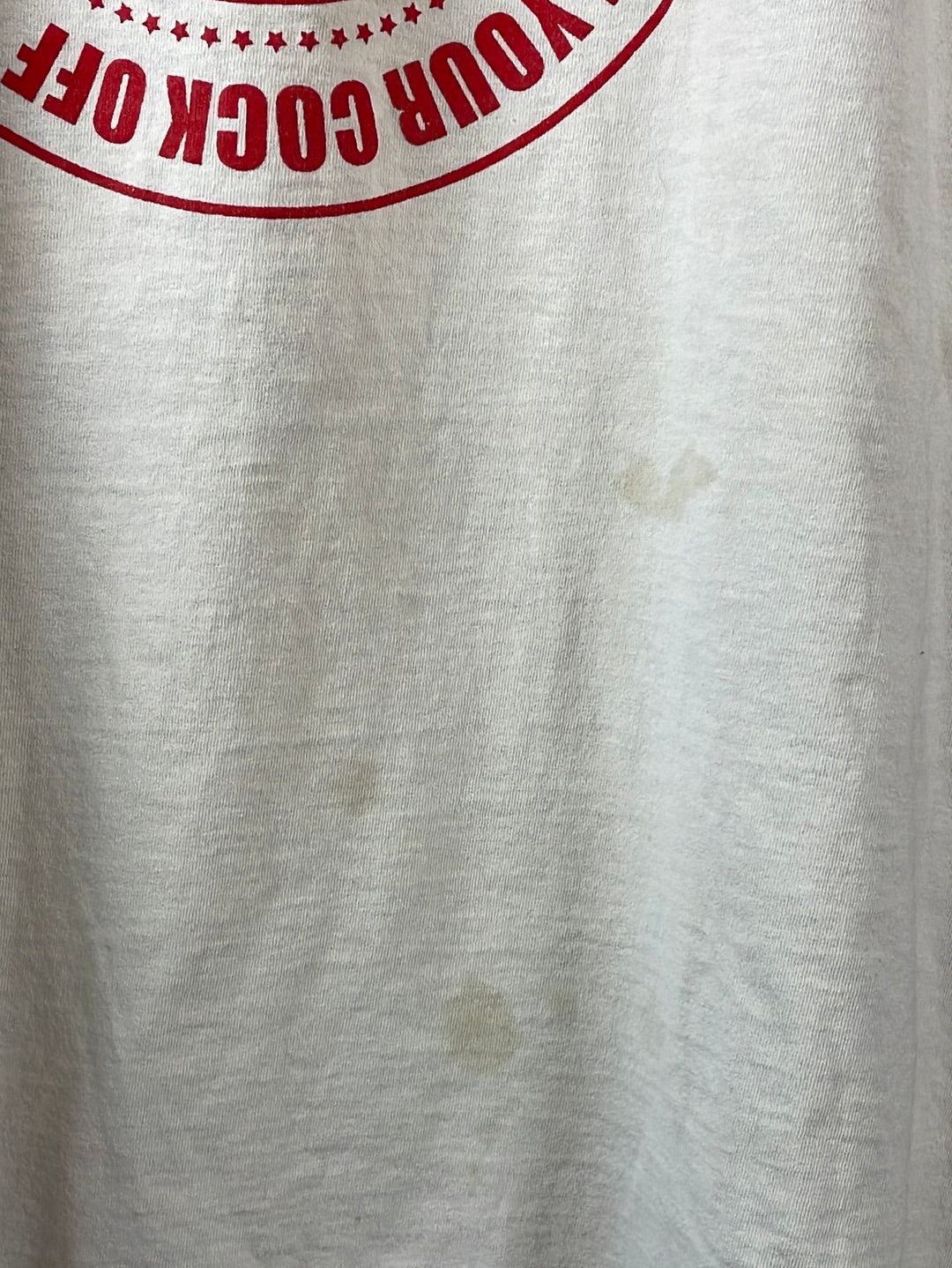 This short sleeve raglan tee is hilarious. It's hard to keep a white shirt clean so you will find some faint stains but no holes or loose stitches.