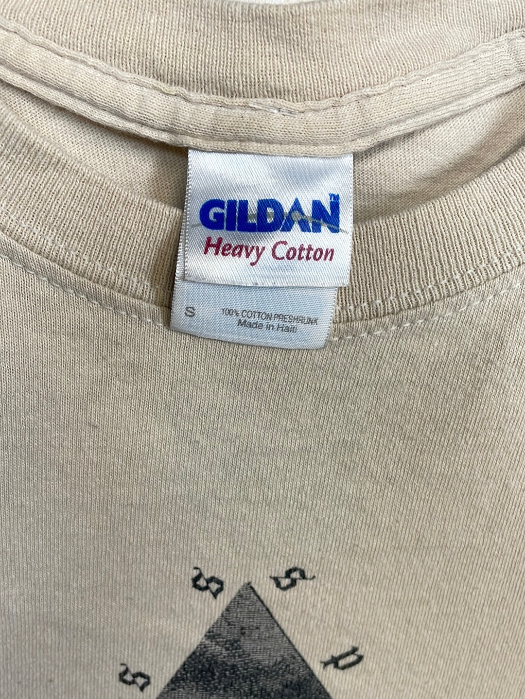 Washed and worn, fabric is lightly faded and graphic has minor distress. Underarm area is slightly discolored.