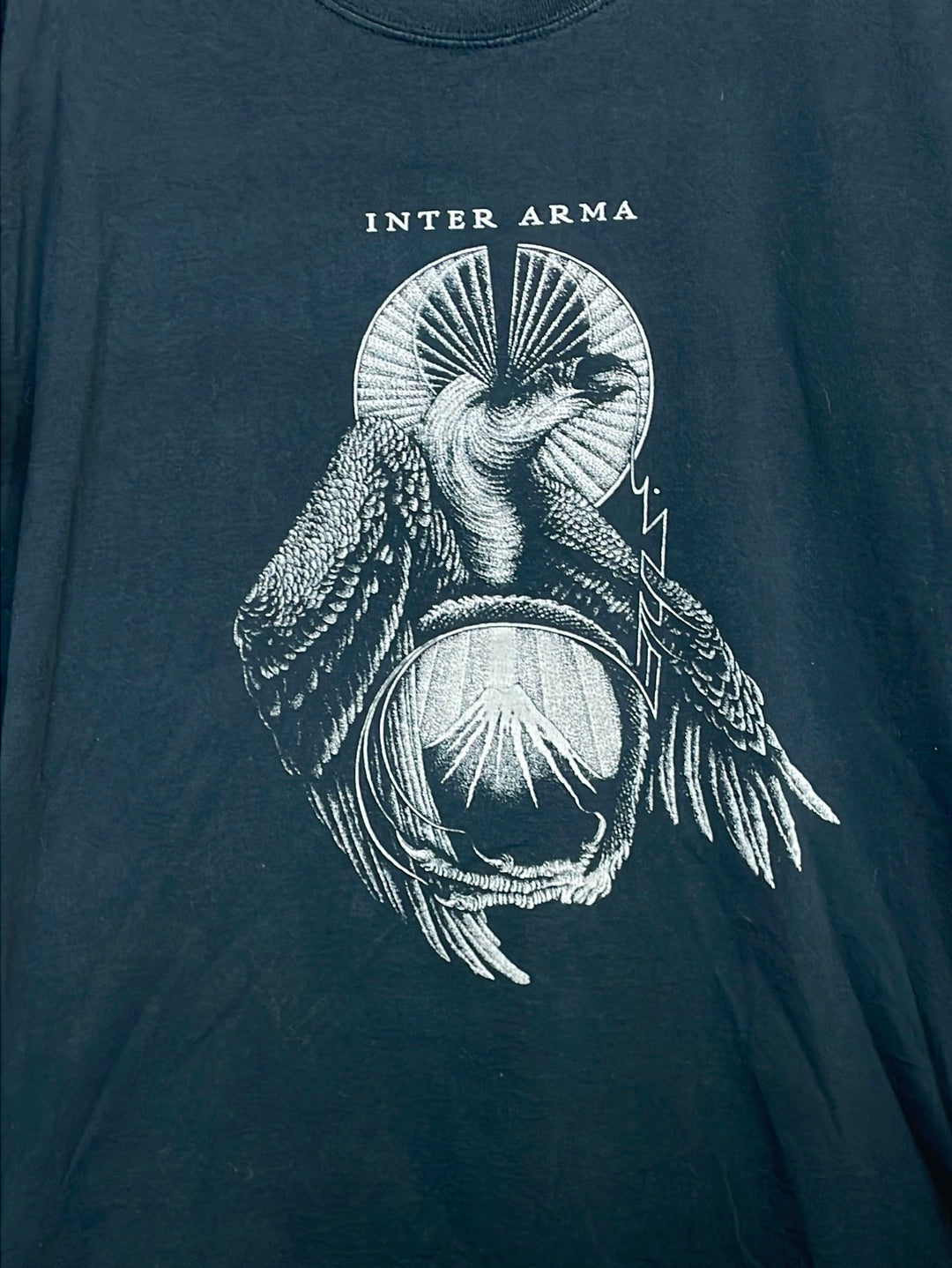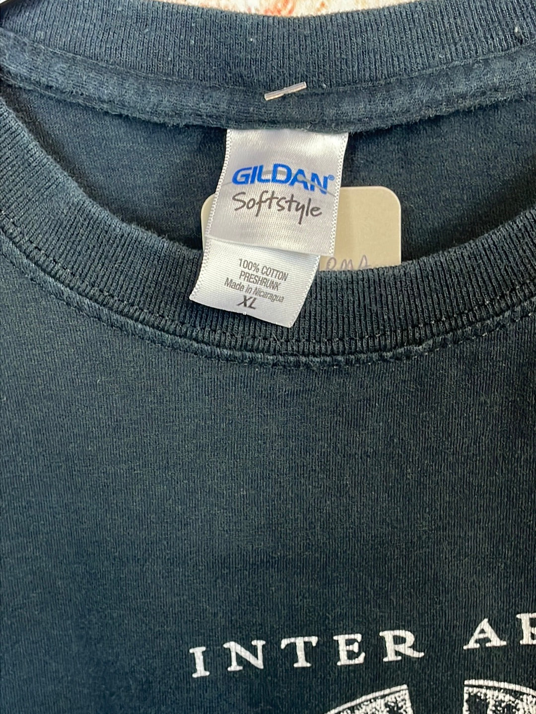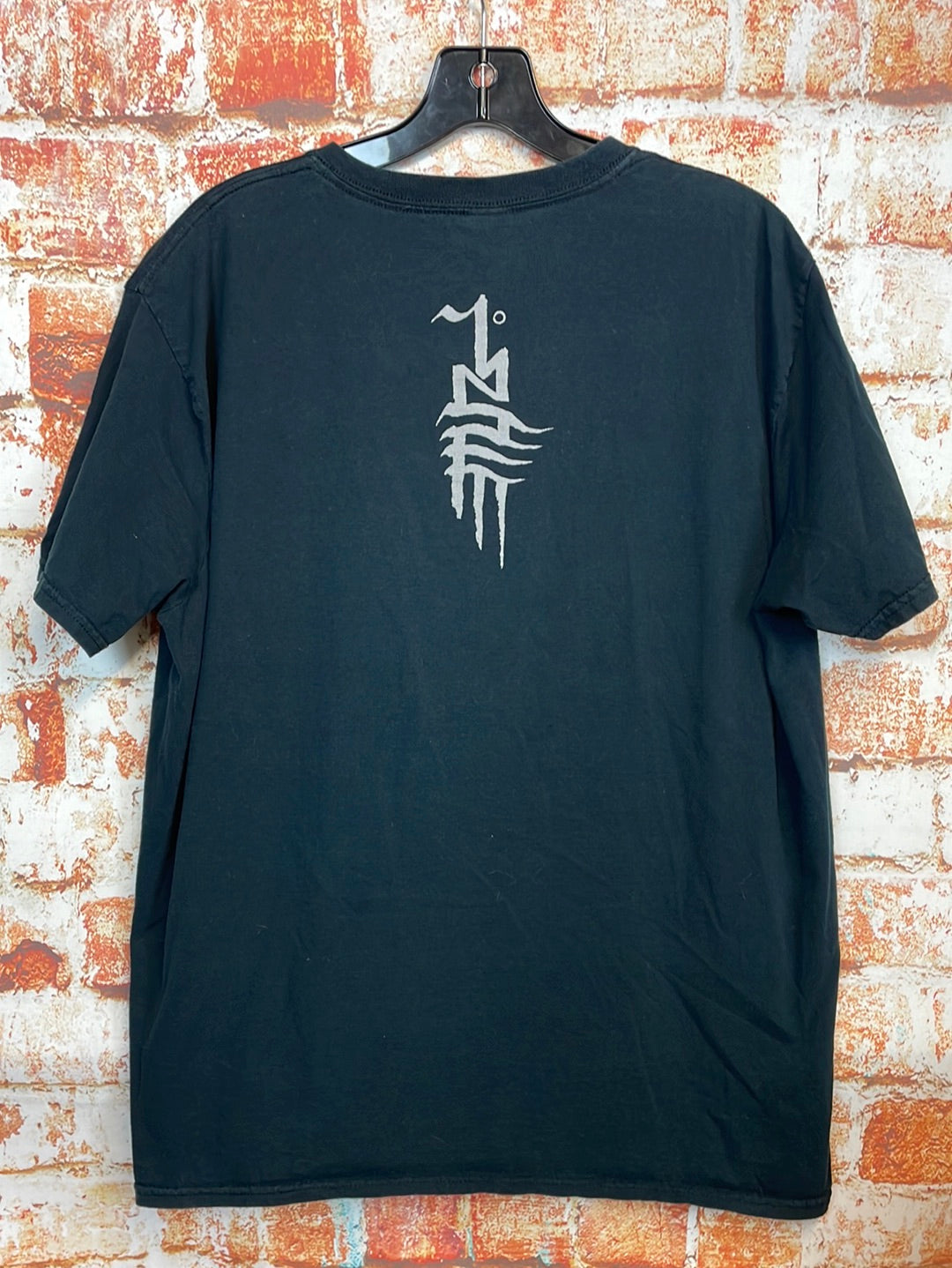 This secondhand tee is washed and worn but only lightly faded. Right armpit has a small hole along the seam, rest of the shirt in great shape.
