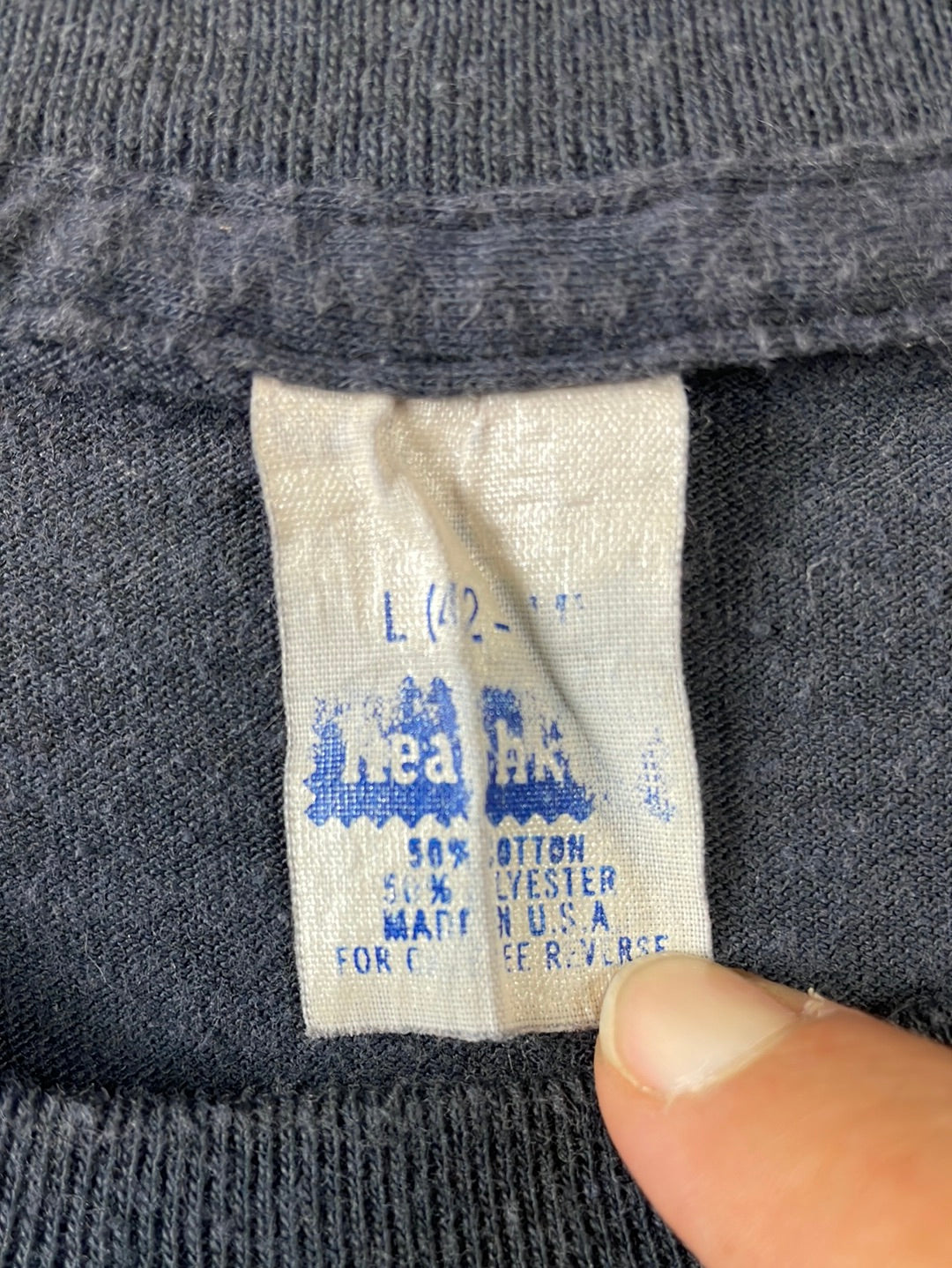 Fabric is faded and worn thin. True vintage single-stitch hems are fully intact and all other seams look good. Graphics are designed with a faux distress and are actually pretty solid. Tag says large but shirt measures closer to a snug medium.