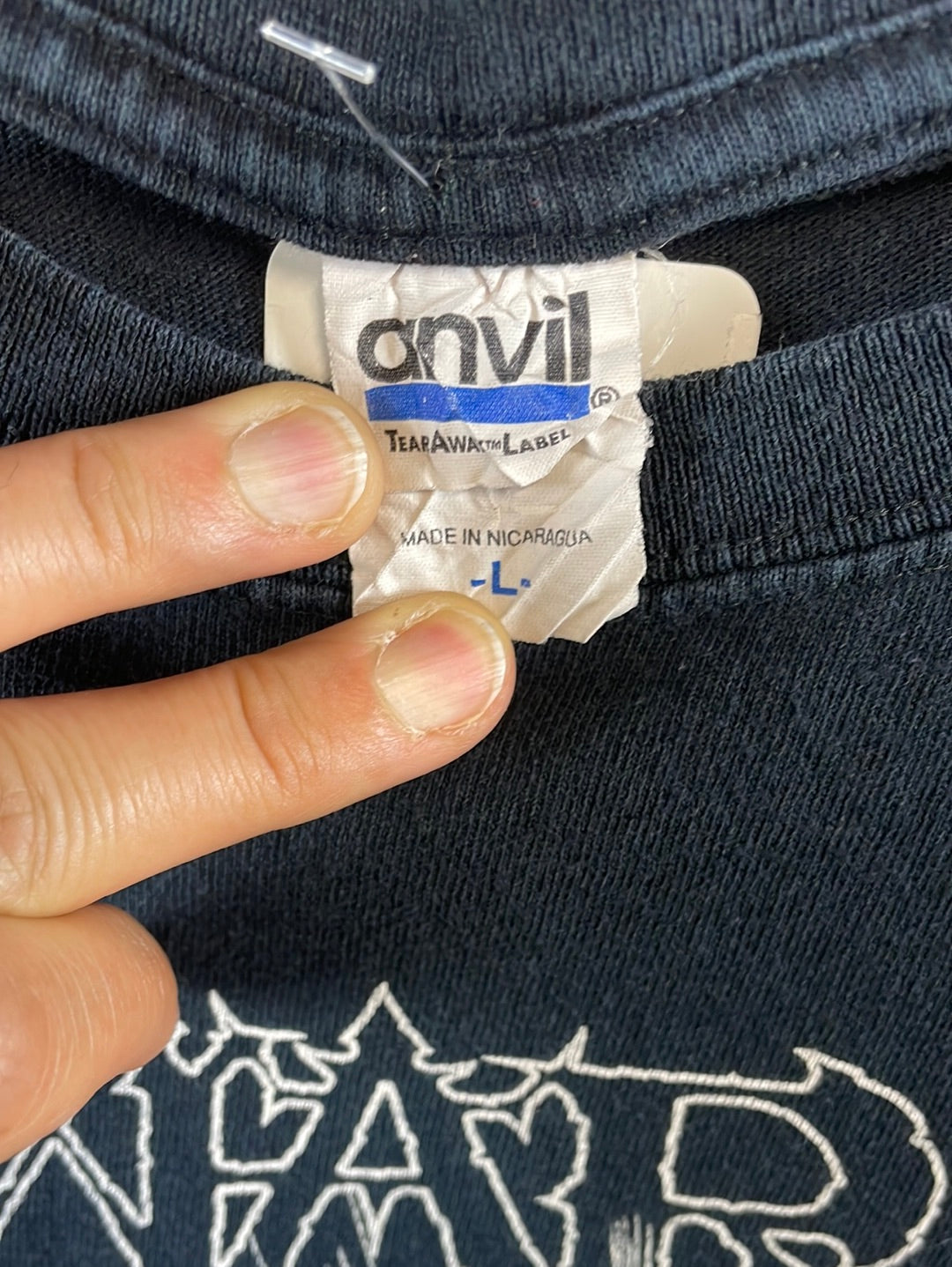 Fabric is dark and solid, discharge print is lightweight and artwork looks sick. Found a tiny stress hole near the collar but no other distress.