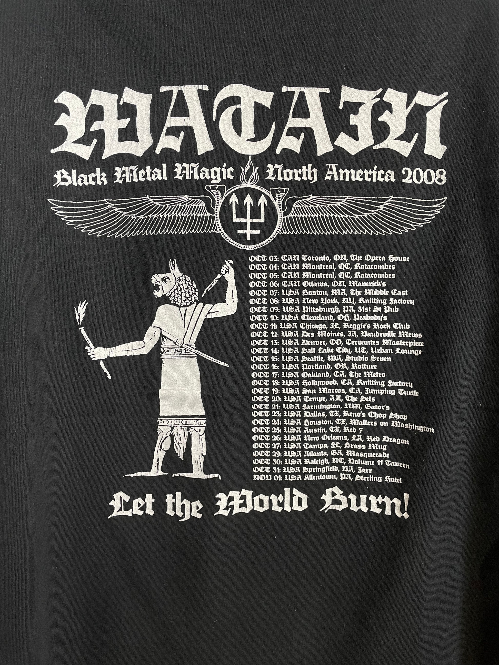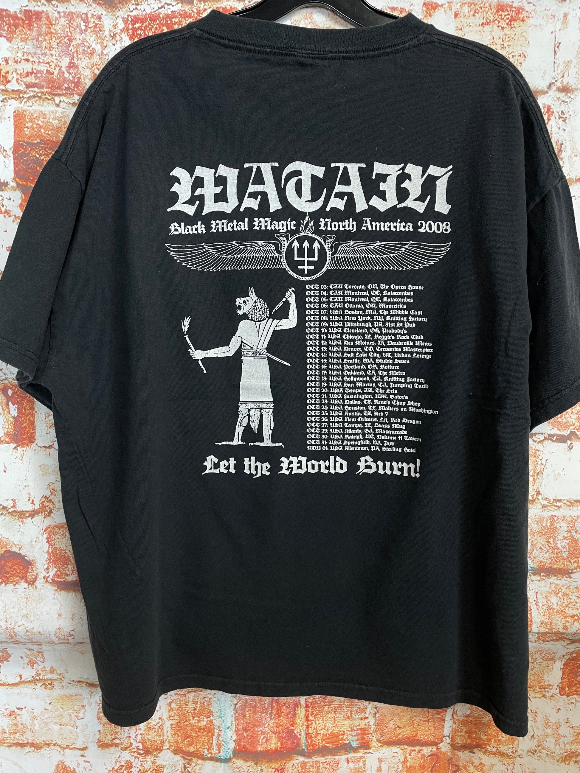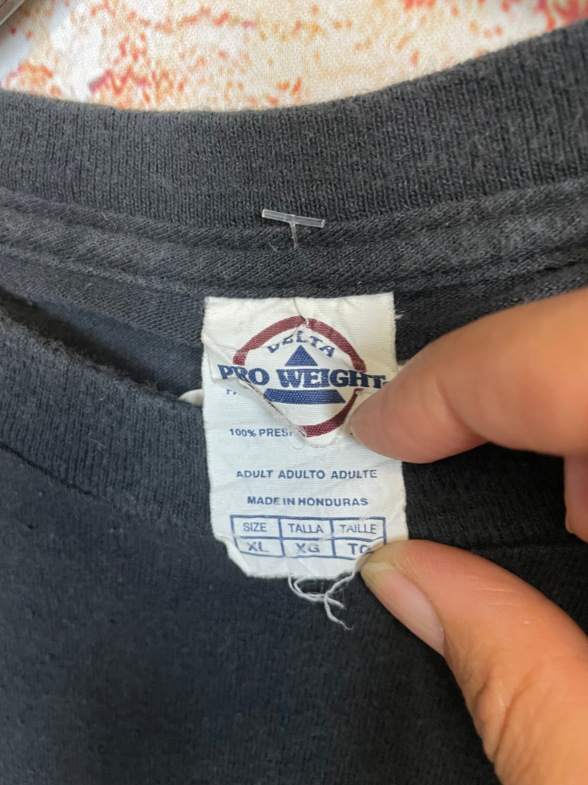 Washed and worn, fabric is a bit faded but graphics are solid. Shape is a bit boxy, check measurements for true fit.